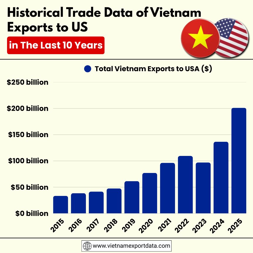 Global trade patterns are undergoing a major transformation. Over the last decade, the United States has gradually diversified its supply chains, reducing dependence on traditional manufacturing hubs while expanding imports from emerging economies. One of the most striking developments in this shift is the rapid rise of Vietnam as a key supplier to the U.S. market. According to the latest Vietnam export data and US import data, the total value of Vietnam exports to US reached $136.50 billion in 2024 and over $201 billion in 2025, a massive 41% increase from the previous year.