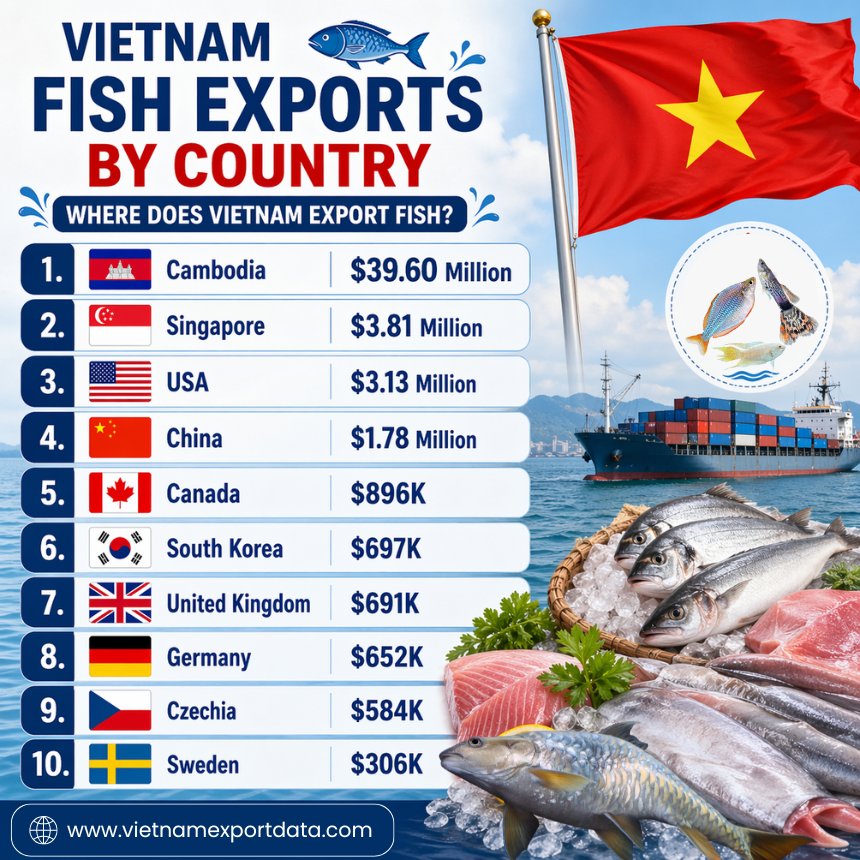 Vietnam is the 3rd largest exporter of fish worldwide, according to global trade data and Vietnam customs data of live fish exports under HS code 0301. This blog breaks down Vietnam’s fish export data for 2025, including export value trends, key markets, product categories, and a structured look at Vietnamese fish suppliers. Whether you’re an importer, exporter, or analyst, this gives you a clear, data-backed view of where the market stands and where it’s heading.