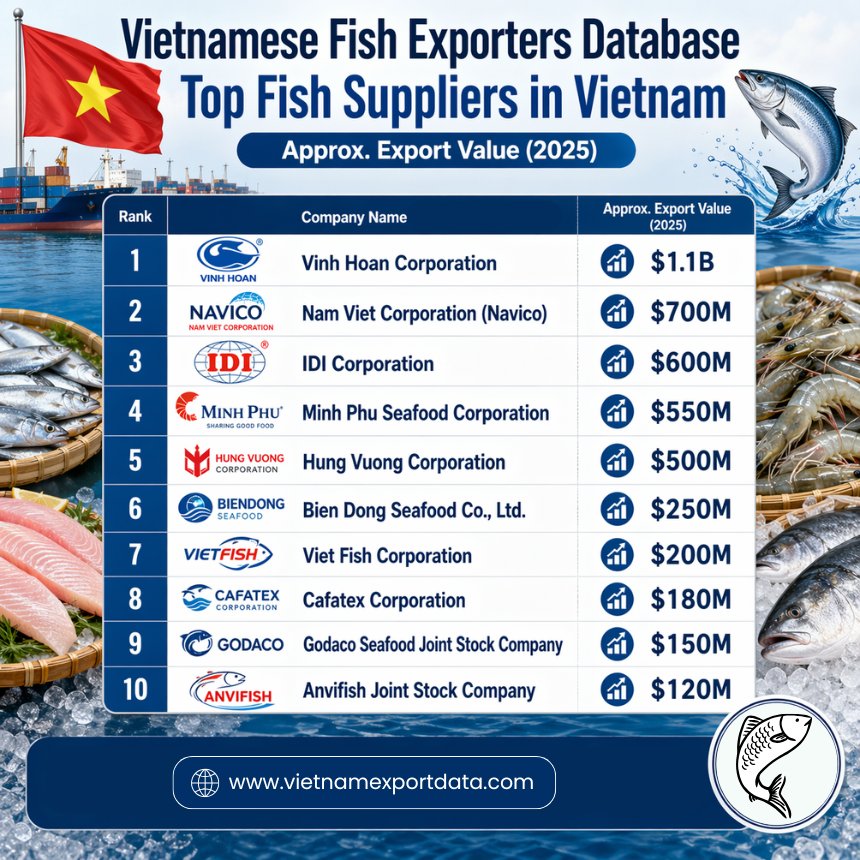 Vietnam has a well-developed network of seafood & fish exporters, ranging from large corporations to mid-sized processors. Vinh Hoan Corporation is the largest fish exporter in Vietnam. The leading fish-exporting companies in Vietnam, as per the Vietnam fish suppliers & exporters database for 2025, include: