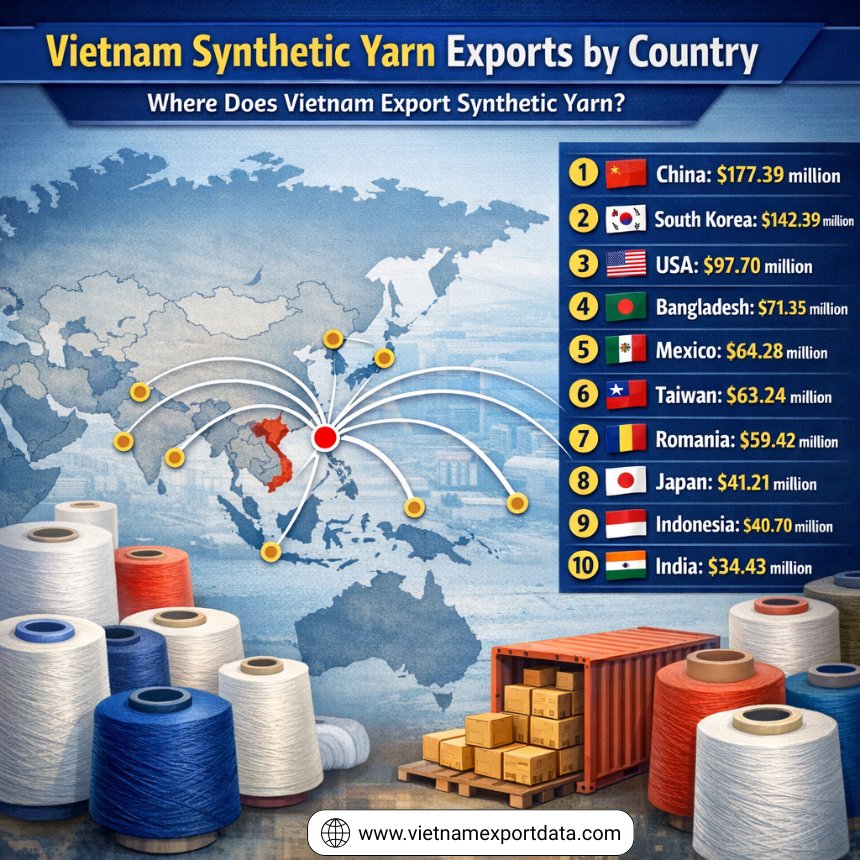 Vietnam exported synthetic yarn worth around $1.05 billion in 2025. Vietnam is the 2nd largest synthetic yarn exporter in the world, according to global trade data and Vietnam synthetic yarn export data. Key trade data and market patterns from verified sources show that: